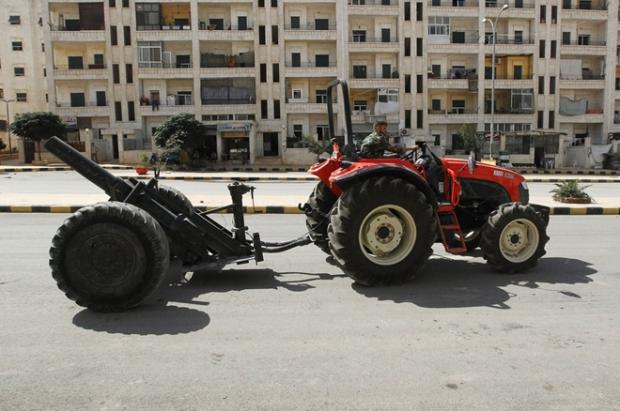 Một chiến binh Quân đội Syria lái máy kéo di chuyển một khẩu đại bác tự tạo ở Aleppo ngày 25-12-2013 (Ảnh: Reuters)