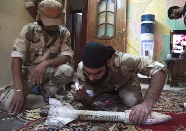 Một chiến binh Quân đội Syria Tự do viết tên đồng đội đã chết lên một quả rocket tự tao để tấn công trả thù Quân đội Chính phủ ở Deir al Zor vào ngày 16-6-2013 (Ảnh: Reuters)