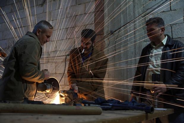 Một thành viên Quân đội Syria Tự do đang nâng cấp một quả đạn pháo tự tạo ở Deir al Zor vào ngày 8-3-2013 (Ảnh: Daily Sabah)