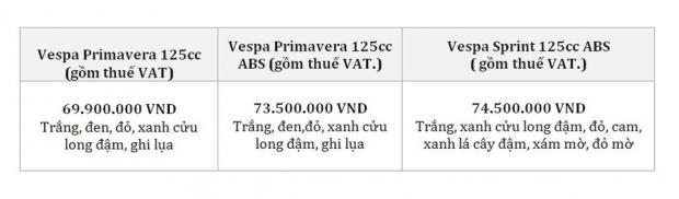 Hiện các mẫu xe Vespa Primavera 125cc, Vespa Sprint 125cc được bán tại hệ thống cửa hàng của Piaggio trên toàn quốc từ 69.900.000 VNĐ cho đến 74.500.000 VNĐ.