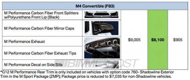 Ngoài M3 và M4, những gói này bao gồm lưới tản nhiệt đen đã tinh chỉnh, cản gió phía sau sợi carbon và chữ “M Performance” trên ngưỡng cửa sau. Ở trên chiếc sedan 3-Series và 2-Series Coupe, gói nâng cấp sẽ có thêm M Performance Front Splitter đen, tính năng này cũng có trên 4-Series với sợi carbon và Carbon / PUR cho M3 và M4.