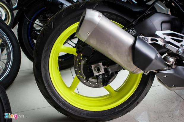 Vành xe màu Neon nổi bật, kích thước 17 inch, đi cùng bộ lốp 120/70-17. Phanh đĩa đôi phía trước đường kính 320 mm, tích hợp ABS. Hệ thống giảm xóc trước hành trình ngược, đường kính 43 mm, hành trình 120 mm.