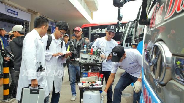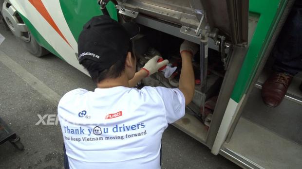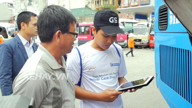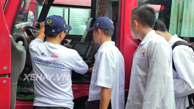 Song song đó, những chiếc xe của các tài xế cũng được các kỹ thuật viên kiểm tra, chăm sóc và tư vấn miễn phí một cách toàn diện: Bệnh Viện Ô Tô phụ trách scan lỗi điện tử, Michelin kiểm tra và tư vấn về lốp, GS đảm nhận việc bảo dưỡng ắc quy, FUSO hướng dẫn cách sử dụng xe hiệu quả, tiết kiệm và an toàn. Trong tổng số 250 xe khách được chăm sóc có 32% số xe có vấn đề về lốp như áp suất không đúng chuẩn, mòn lốp, cần cân chỉnh độ chụm..., 58% số xe có vấn đề về ắc quy cần vệ sinh, châm nước, cần sạc thêm.., 37% số xe có vấn đề về động cơ và 38% gặp vấn đề về gầm thắng, hộp số..
