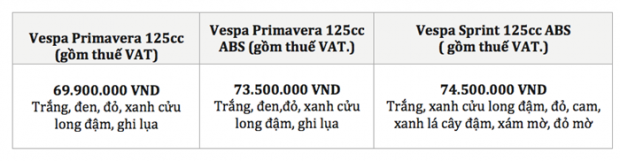 Bảng giá xe Vespa Primavera và Sprint 2016