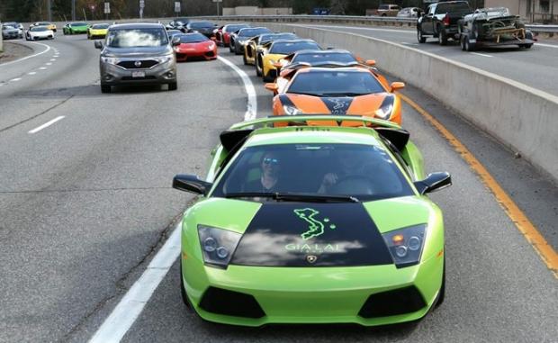 Đoàn siêu xe chủ yếu là các model Lamborghini, trong đó có một chiếc Lamborghini Murcielago màu xanh cốm.