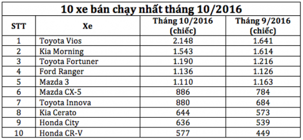 10 xe bán chạy nhất tháng 9/2016