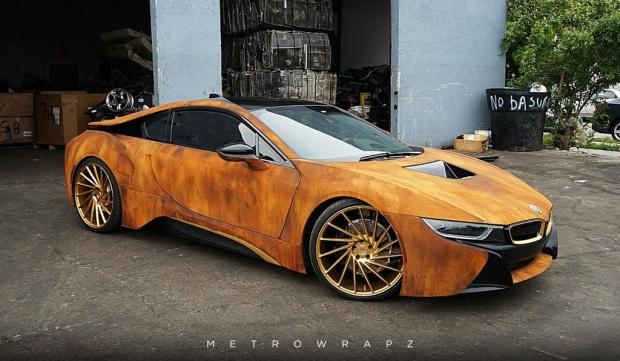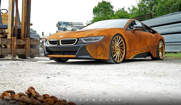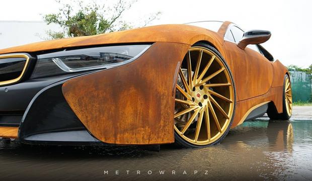 Những ai lái xe cạnh chiếc i8 này có lẽ sẽ cảm thấy hơi khó chịu, tuy nhiên ít nhất thì lớp bọc gỉ đã được hoàn thiện với bộ la zăng vàng của Vossen Wheels.