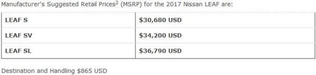 Nissan Leaf 2017 tiếp tục được cung cấp với ba cấp độ S, SV và SL, tuy nhiên có một thay đổi nhỏ là phiên bản S (cơ bản) bây giờ đã có thể được hưởng lợi từ gói pin 30kWh. Với giá bán tăng từ 29.010 USD (~ 645 triệu VNĐ) đến 30.680 USD (~ 682 triệu VNĐ).