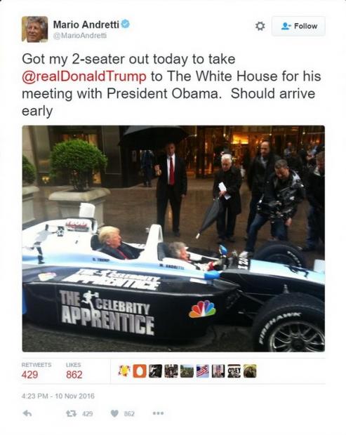 Thật ra, Andretti đã từng đi cùng Trump năm 2012, khi Trump đang tham gia một chương trình truyền hình thực tế có tên Celebrity Apprentice. Ai có thể nghĩ rằng người đàn ông đó bốn năm sau lại chính là tổng thống Mỹ?