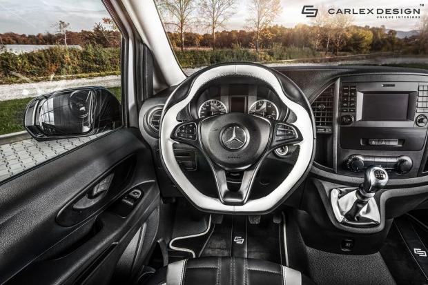 Về nội thất, Carlex đem lại một không gian hiện đại hơn, trẻ trung hơn cho khoang cabin của Vito bằng việc kết hợp bọc da đen và trắng trên hầu hết các bộ phận, từ thảm trải sàn đến ghế ngồi, vô lăng, những nút bấm, bảng điều khiển, tựa tay.