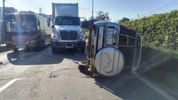 Ngay lúc này, xe container mang BKS 51C-678.07 lao tới phải phanh gấp, tránh đâm vào ô tô đang gặp nạn. 3 người trong chiếc ô tô lật ngang thoát chết trong gang tấc, đạp cửa bò lra ngoài.