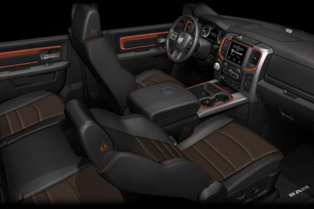 Nội thất của xe kết hợp màu cam với ghế ngồi màu đen, logo Ram màu da cam trên tựa đầu và đường chỉ khâu tương phản màu da cam. Giống như Mojave Sand, chỉ có 1.500 chiếc Ignition Orange Sport được sản xuất và chỉ dùng động vơ V8.