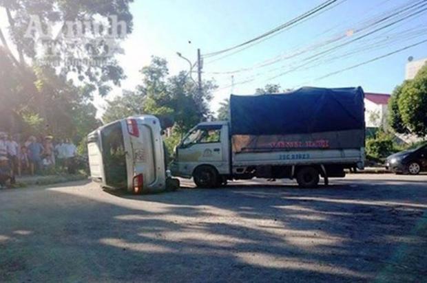 Sau cú va chạm, chiếc ô tô lật nghiêng tại chỗ, hông xe bị biến dạng. Xe tải bị méo phần đầu. Tài xế hai xe đều chấn thương nhẹ.