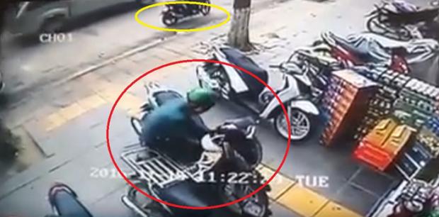 Tên trộm (khoanh màu đỏ) đang phá khóa xe SH và đồng bọn (khoanh màu vàng) đứng chờ sẵn dưới lòng đường. Ảnh chụp từ clip. Sự việc xảy ra vào lúc 11h20 ngày 15/11/2016 tại một tiệm tạp hóa tại số 109 Trần Duy Hưng, Hà Nội và bị camera của cửa hàng ghi hình lại.