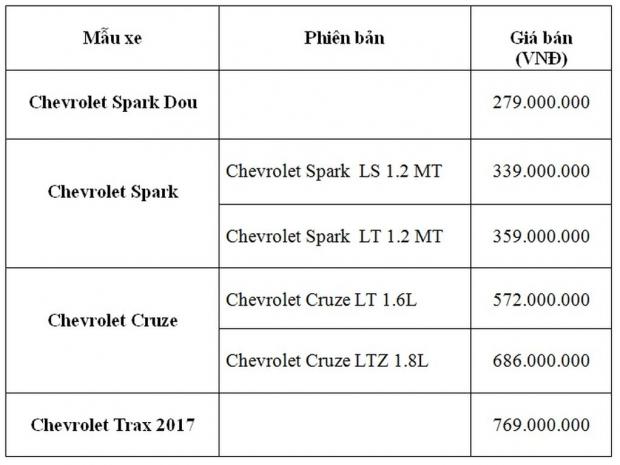 Sau đây là bảng giá bán cụ thể của các mẫu xe Chevrolet Spark Dou, Chevrolet Spark, Chevrolet Cruze, Chevrolet Trax 2017 :