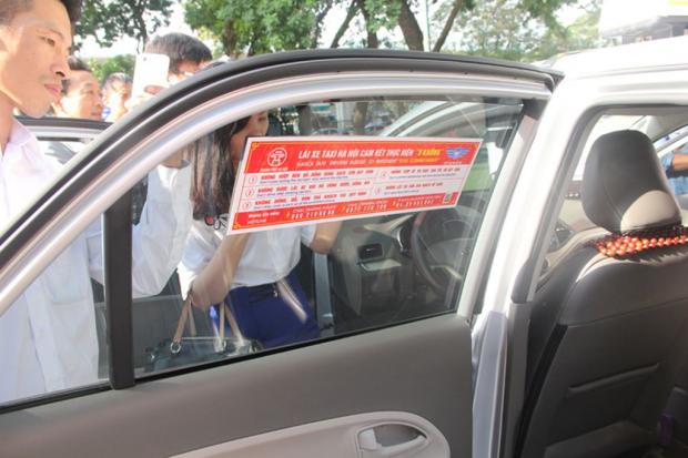 Nội dung tuyên truyền trên các tấm đề can gồm: Lái xe taxi Hà Nội cam kết thực hiện 5 KHÔNG: (1) “Không vượt đèn đỏ; Dừng đúng vạch sơn quy định”, (2) “Không được lái xe khi đã uống rượu, uống bia”, (3) “Không dừng, đỗ, đón trả khách sai quy định”, (4) “Không vượt ẩu và chạy quá tốc độ quy định”, (5) “Không lấy tài sản của khách để quên”; Số điện thoại đường dây nóng CSGT: 069.219.6886; CSHS: 0977.778.189; Sở GTVT: 04.858.930.82.