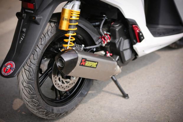 Điều nổi bật nhất của chiếc Honda SH 150i 2017 chính là ở bộ ống xả Akrapovic để mang lại âm thanh ấn tượng hơn cho chiếc xe.
