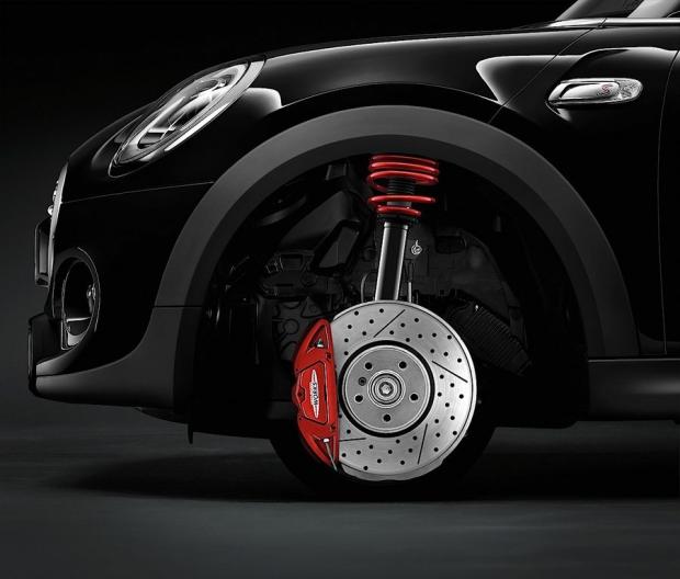 Các phụ kiện JCW bao gồm hệ thống phanh với kẹp phanh 4 piston cố định với các đĩa đục lỗ ở phía trước và kẹp phanh 1 piston ở phía sau. Theo dự kiến, kẹp phanh sẽ được hoàn thành trong màu sơn đỏ Chili Red.