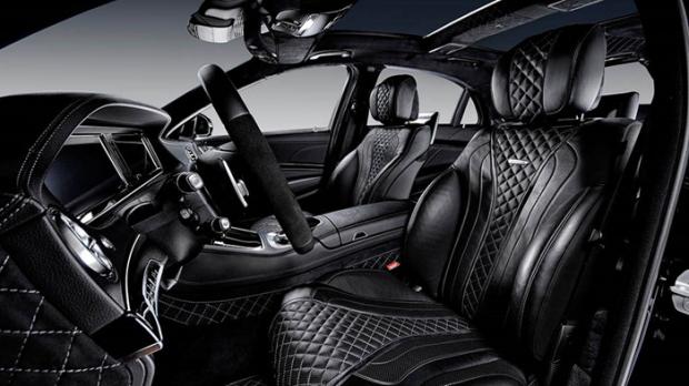 Các chuyên gia ở Vilner bọc lại nội thất chiếc AMG S 63 với chất liệu da cao cấp và Alcantara. Ấn tượng về sự đen tuyền, huyền bí được thể hiện một cách khéo léo. Hoạ tiết mạng hình thoi được áp dụng rộng rãi, từ ghế ngồi, đến nhiều vùng khác nhau trong khoang cabin và thậm chí cả nắp khoang hành lý sau. Một số chi tiết ốp gỗ nguyên bản được thay bằng ốp gỗ đen bóng Piano.