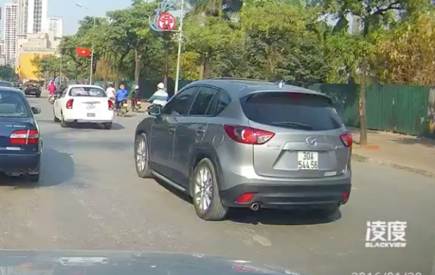 Tài xế lái chiếc Mazda CX-5 liên tục có hành vi đánh võng trên đường và cuối cùng bất ngờ đánh lái gấp sang bên phải để đâm gục người đi xe Honda Wave. Chiếc Mazda CX-5 có hành vi lái xe cực kỳ nguy hiểm trên phố. Ảnh chụp từ clip
