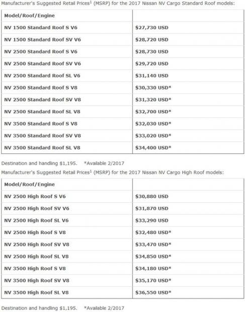 Giá khởi điểm của Cargo là từ 30.880 $ (~701 triệu VNĐ), và có thể lên tới 36.550 $, tương đương 830 triệu VNĐ (chưa tính phí vận chuyển và xử lý 1.195 $, ~ 27 triệu VNĐ). Trong khi đó Nissan NV Passenger Van có thể dùng cho cá nhân hoặc tập thể, có giá từ 33.800 $ (768 triệu VNĐ) và cao nhất là 41.200 $ (936 triệu VNĐ).