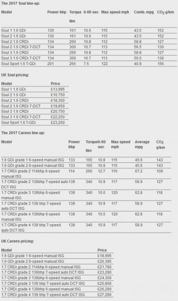 Phiên bản MPV cỡ nhỏ của Kia là Carens, được cung cấp bốn cấp độ trang trí -1, 2, 3 và 4, và đặc trưng với nội thất sửa đổi nhẹ, la zăng hợp kim mới 16 hoặc 17 inch cho tất cả các cấp độ. Các trang bị tiêu chuẩn bao gồm đèn chạy ban ngày LED, đèn project đi kèm đèn báo rẽ, vô lăng và lẫy chuyển số bọc da, tay vịn trung tâm, điều hòa nhiệt độ, thông gió phía sau, kiểm soát hành trình với tính năng giới hạn tốc độ, Bluetooth với chức năng nhận diện giọng nói, phát nhạc và khóa trung tâm từ xa, có giá từ 18.995 bảng (550 triệu VNĐ).