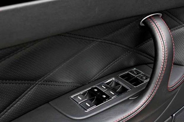 Ghế ngồi bọc da, với điểm nhấn là các đường chỉ đỏ.