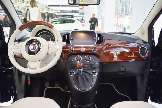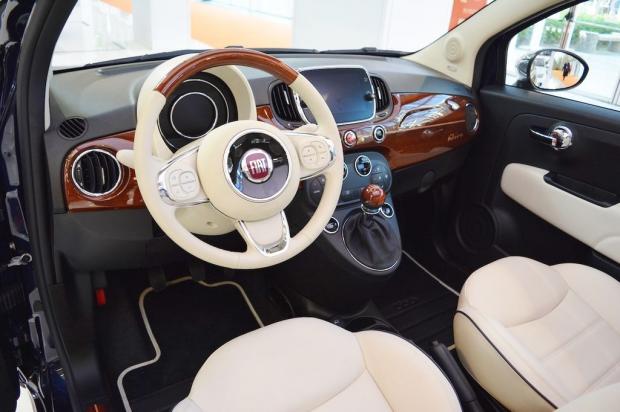 Fiat 500 Riva độc đáo từ trong ra ngoài. Bảng điều khiển được làm bằng gỗ đào hoa tâm thật với những chi tiết khảm gỗ cây phong, chất liệu này cũng dược dùng cho những du thuyền của Riva. Các tấm cửa và cần gạt số được khắc ra từ một tấm gỗ hoa tâm cứng. Về các ghế ngồi, Fiat đã sử dụng bọc da ngà độc đáo của Poltrona Frau. Trên các ghế ngồi còn có đường khâu màu ngà nhưng ở tông màu khác còn đường viền thì màu xanh dương Sera Blue.