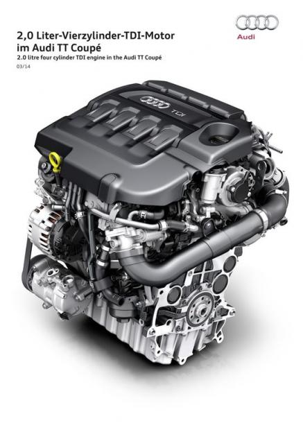 Động cơ TDI dùng cho Audi TT sản sinh 181 mã lực và mô men xoắn 380 Nm. Phiên bản dùng hệ dẫn động Quattro và hộp số ly hợp kép S Tronic cần 6,7 giây để tăng tốc từ 0-100 km/h và tốc độ tối đa đạt 234km/h, trong khi đó phiên bản roadster chậm hơn 0,3 giây và có thể đạt tốc độ 230 km/h. Mức tiêu hao nhiên liệu NEDC đạt 5,2 lít/100 km cho phiên bản coupe và 5,4 lít/100km cho phiên bản mui trần.