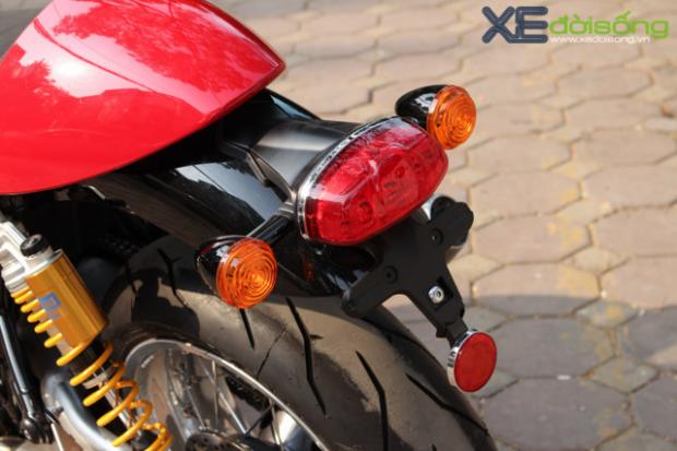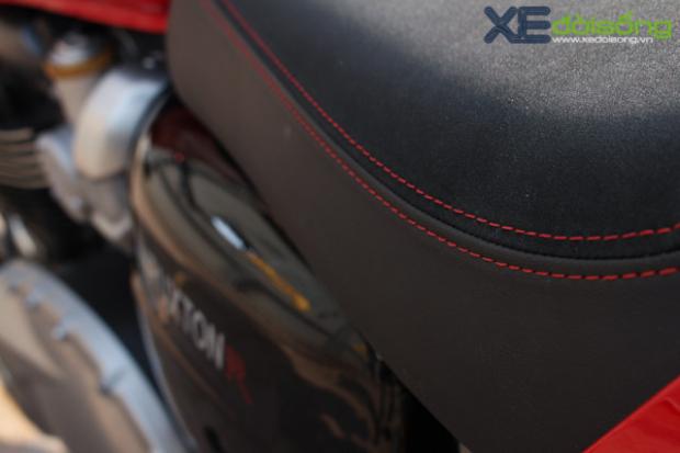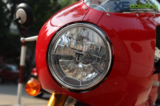Ngoài ra, đèn pha của xe còn được bổ sung đèn chiếu sáng ban ngày LED nằm ở phía dưới. Đi cùng với hệ thống đèn pha này là bộ kit ốp đầu và kính chắn gió Front Farring Diablo Red mang đậm phong cách cafe racer được nhập về chính hãng và lắp riêng cho dòng thruxton R.