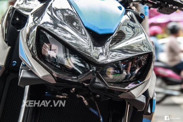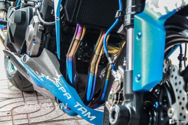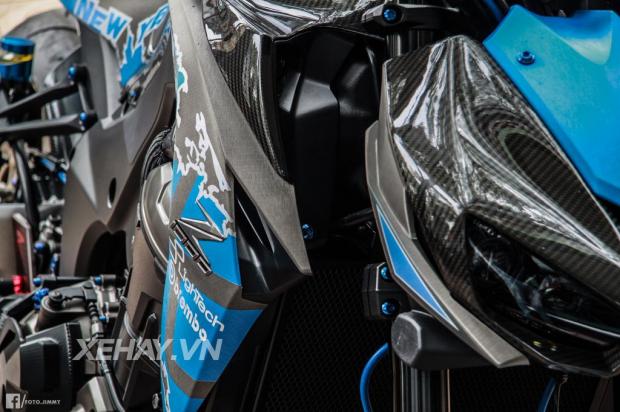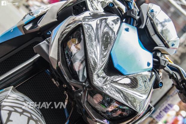 Sở hữu ngoại hình hầm hố theo ngôn ngữ Sugomi Nhật Bản, chiếc Kawsaki Z1000 trông như 1 con báo chồm về phía trước. Ở bản độ lần này, chiếc xe khoác lên mình dàn áo nhôm xước với tone xanh chủ đạo cùng dòng chữ chúc mừng năm mới 2017.