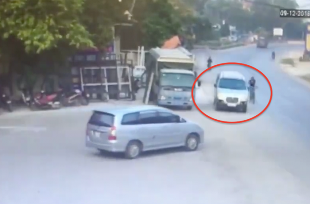 Dù khuất tầm nhìn nhưng tài xế xe Toyota Innova vẫn sang đường, đúng lúc chiếc xe tải từ xa lao đến.