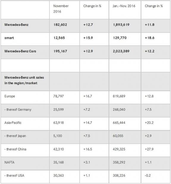 Được thúc đẩy bởi C-Class Sedan và Estate, hai mẫu xe bán chạy nhất của hãng trong tháng Mười Một, Mercedes-Benz đã bán ra 182.602 xe trên toàn thế giới trong tháng vừa qua, doanh số tăng 12,7%. Nhu cầu về E-Class cũng rất lớn, đồng thời các phiên bản SUV của hãng cũng tăng đáng kể, đặc biệt là GLC.