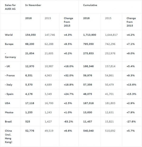 Mặt khác, Audi cũng rất đắt hàng với các mẫu xe mới của hãng, như Q2 và A5, trong khi đó tại Mỹ, Q7 là một trong những mẫu xe bán chạy nhất. Tổng cộng, thương hiệu bốn vòng tròn đã bán ra 154.050 chiếc xe, tăng 4,3 % so với tháng Mười Một năm ngoái.