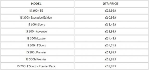 Bắt đầu cho mẫu xe này tại thị trường tay lái nghịch lớn nhất châu Âu là IS 300h SE, có giá 29.995 Bảng (852 triệu VNĐ), trong khi đó phiên bản 300h F Sport có giá từ 34.745 Bảng (987 triệu VNĐ). Biến thể đắt nhất mang tên 200t F Sport có thêm gói cao cấp Premier Pack, với giá từ 38.995 Bảng (1 tỷ 108 triệu VNĐ).