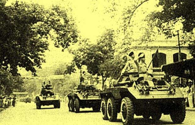 Năm 1945, với âm mưu trở lại nước ta xâm lược một lần nữa, Pháp đã tìm cách đưa quân ra Bắc Bộ, đánh chiếm Hải Phòng, Lạng Sơn, Hải Dương, gây nhiều vụ xung đột, khiêu khích ở Hà Nội. Trong ảnh, là những chiếc xe tăng, xe bọc thép của quân đội Pháp ngang nhiên đi trên đường phố Hà Nội năm 1946