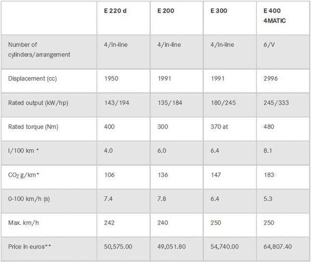 Phiên bản hàng đầu hiện tại là E-Class E400 4Matic, có giá khởi điểm 64.807.40 Euro (1 tỷ 827 triệu VNĐ). Xe dùng động cơ xăng V6 3.0 lít 328 mã lực và cần 5,3 giây để bứt tốc từ 0-100 km/h, tốc độ tối đa 250 km/h. Trong chu kỳ Nạp Nén Nổ Xả, xe tiêu hao 8,1 lít/100 km và thải khí CO2 183 g/km.