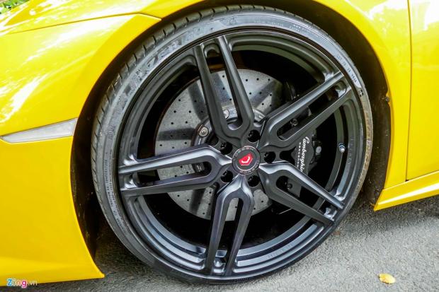 Bên cạnh đó, siêu bò Lamborghini này còn được trang bị bộ vành Vossen Forged năm chấu kép có kích thước 20 inch bánh trước và 21 inch bánh sau. Bộ vành này được sơn đen mờ khá khoẻ khoắn, để lộ ra bộ phanh đĩa cỡ lớn bên trong.