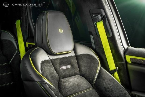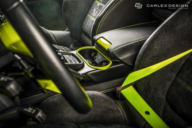 Vì thế mà Carlex Design không chỉ tuỳ chỉnh ghế ngồi của xe, mà còn ở cửa xe, và bảng điều khiển. Màu xanh acid được áp dụng mọi nơi, bao gồm cả viền lưới tản nhiệt của loa, các chấu của vô lăng, cửa điều hòa khí và lẫy chuyển số. Ngoài dây an toàn màu xanh neon, có thể thấy kiến trúc hoàn chỉnh của nội thất xe với tất cả những phần trang trí và bọc vải.