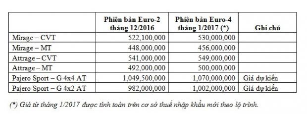 Đồng thời, công ty cho biết mức giá xe cũng sẽ tăng lên đáng kể so với hiện hành. Theo đó, giá xe Mirage và Attrage tăng 8 triệu đồng, còn Pajero Sport tăng 20 triệu đồng.