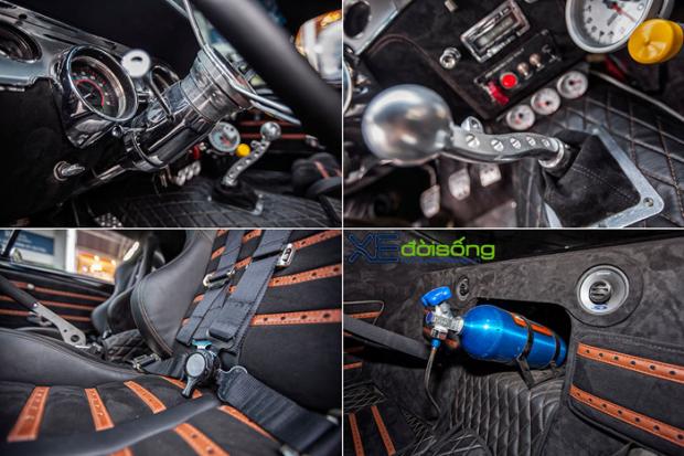 Bộ lốp trước bản mỏng kích cỡ 225/35ZR20, tuy nhiên lốp sau là loại có bề ngang lớn, kích cỡ 305/30ZR20 để đảm bảo phát huy tối đa độ bám cũng như lực xoắn lớn từ động cơ.Khoang lái của chiếc Mustang “Eleanor” này được nâng cấp theo phong cách xe đua đường phố, phối màu đen chủ đạo với những chi tiết điểm nhấn màu cam. Hai ghế ngồi kiểu xe đua có ốp lưng ghế carbon với bộ dây đai an toàn khoá trung tâm. Vô-lăng, bảng đồng hồ, cần số hay cụm pê-đan đều là hàng nhập từ nước ngoài, thể hiện vẻ đẹp kim khí thuần chất. Cụm đồng hồ kiểu xe đua cũng được bổ sung thêm và gắn ở bệ trung tâm, cho phép kiểm soát các thông số quan trọng của hệ động lực như áp suất dầu bôi trơn, điện áp, nhiệt độ nước làm mát. Một chi tiết không thể bỏ qua là xe được gắn thêm hệ thống NOS – một thứ “vũ khí” thường được các tay đua đường phố sử dụng.