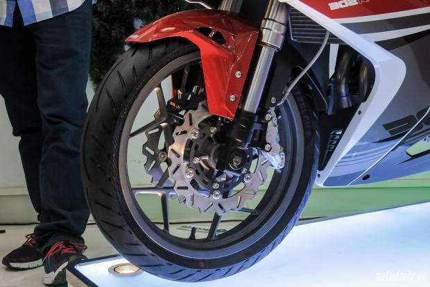 Ở phía trước, xe dùng phuộc up-side-down đường kính 41mm, lốp 110/70 và phanh đĩa đôi 260mm thiết kế rườm rà dạng răng cưa. Trong khi đó, phía sau là phuộc đơn monosock, lốp 150/60 và phanh đĩa đơn 240mm. Mâm xe trước và sau đều có kích thước 17 inch.