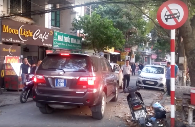 Chiếc Fortuner biển xanh đi vào đường cấm ôtô nhưng không chịu nhường đường. Ảnh cắt từ clip. Sự việc xảy ra chiều hôm qua 25/12, tại đường ven hồ Láng, đoạn từ phố Chùa Láng, Hà Nội, rẽ vào. Theo clip, chiếc xe đã đi vào theo chiều cấm ôtô, gây tắc đường khi gặp xe taxi đi ngược chiều.