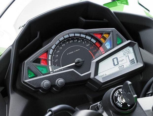 Cụm đồng hồ trung tâm của Kawasaki Ninja 300 2017 vẫn kết hợp giữa dạng analogue và kỹ thauatj số. Đáng tiếc là trên cụm đồng hồ của Kawasaki Ninja 300 2017 tiếp tục thiếu vắng đèn báo vị trí cấp số.