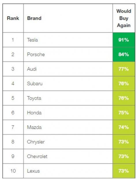 Dẫn đầu bảng đánh giá là Tesla, có 91% ý kiến người được hỏi cho biết nếu có thể họ sẽ vẫn chọn sử dụng mẫu EV thêm một lần nữa. Đứng vị trí số hai là Porsche với 84%, thứ 3 là Audi với 77% và thứ tư là Subaru với sự hài lòng là 76%.