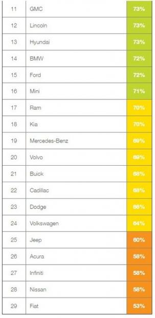 Nằm trong top 10 là Toyota (76%), Honda (75%), Mazda (74%), Chrysler (73%), Chevrolet (73%) và Lexus (73%) và đứng cuối bảng xếp hạng là Jeep, Acura, Infiniti, Nissan. Fiat