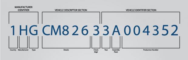 17 ký tự trên số VIN được chia làm 6 phần khác nhau: 3 ký tự đầu tiên cho biết thông tin về nhà sản xuất (Manufacturer Identifier), 6 ký tự tiếp theo (từ ký tự thứ 4 đến thứ 9) miêu tả chiếc xe (Vehicle Descriptor Section), 8 ký tự còn lại dùng để nhận dạng xe (Vehicle Identifier Section):