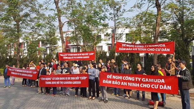 Sau khi trộm, cướp xuất hiện tại khu biệt thự liền kề Gamuda, nhiều người dân đem theo băng rôn kéo tới Ban quản lý để khiếu nại.