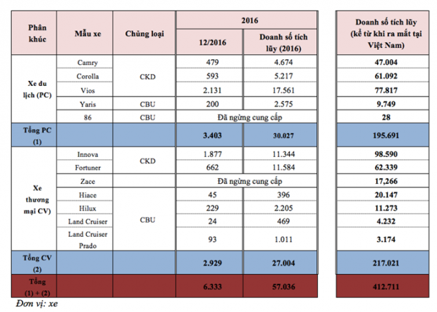 Theo thống kê mới nhất từ Toyota Việt Nam (TMV), trong năm 2016 liên doanh Nhật Bản bán được 57.036 xe, tăng 13% so với năm 2015, trong đó xe du lịch đạt 30.027 xe, xe thương mại đạt 27.009 xe, tăng lần lượt 11% và 17%. Nhờ đó, tổng lượng bán cộng dồn kể từ khi Toyota hoạt động tại Việt Nam đến nay là 412.711 xe.