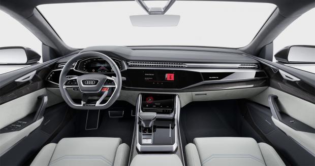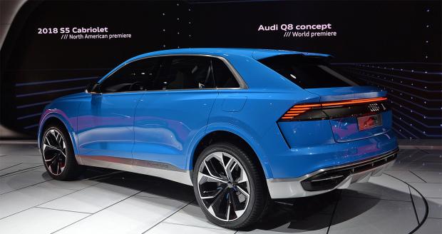 Audi Q8 Concept vừa trình làng sở hữu thiết kế hiện đại đậm chất tương lai. Phần mui xe được làm hơi vát xuống, đuôi xe cũng có thiết kế tương tự những mẫu xe Coupe. Audi cho biết, Q8 Concept là một mẫu xe vừa thể hiện chất thể thao, vẻ sexy của một mẫu Coupe vừa sở hữu đầy đủ các chức năng, độ tiện nghi của một mẫu SUV. Chiều dài cơ sở của xe ở mức 3m giúp cung cấp một không gian rộng rãi thoải mái cho 2 hàng ghế ngồi.